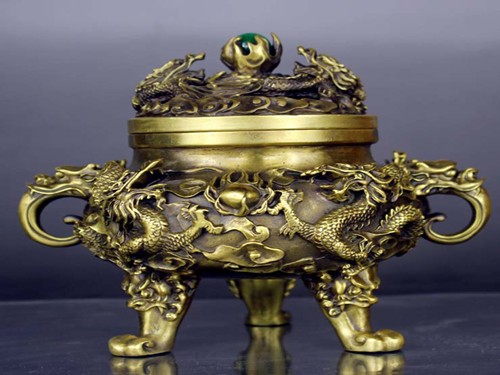 我國的金屬工藝品按資料可分為金器、銀器、銅器(包含仿古銅、斑銅等)、錫器、鐵畫等。按用途分為有用品、陳列品和首飾 3類。有用品有瓶、盤、爐、火鍋、銅壺、銀餐具和錫酒具、茶具等日用器皿,以及宗教佛事用品如鐘、罄、爐、鈴等。這類有用工藝品一般都經鑄、鍛、刻、鏤、焊、嵌等工藝,具有類似浮雕的裝飾,不同于一般日用品。陳列品有屏風、壁飾、擺件、車飾、馬飾、轎飾,各種仿古品如鼎、熏、鹵、觚、爵等。首飾有頭簪、戒指、手鐲、項圈、耳環(huán)、領帶夾、袖扣、胸花、領花等。